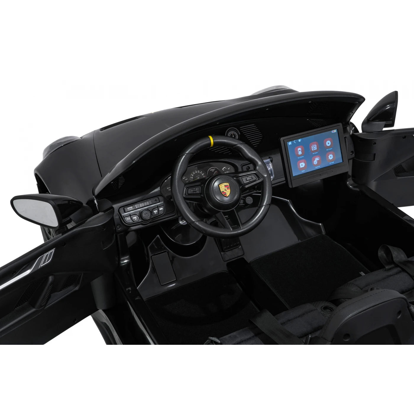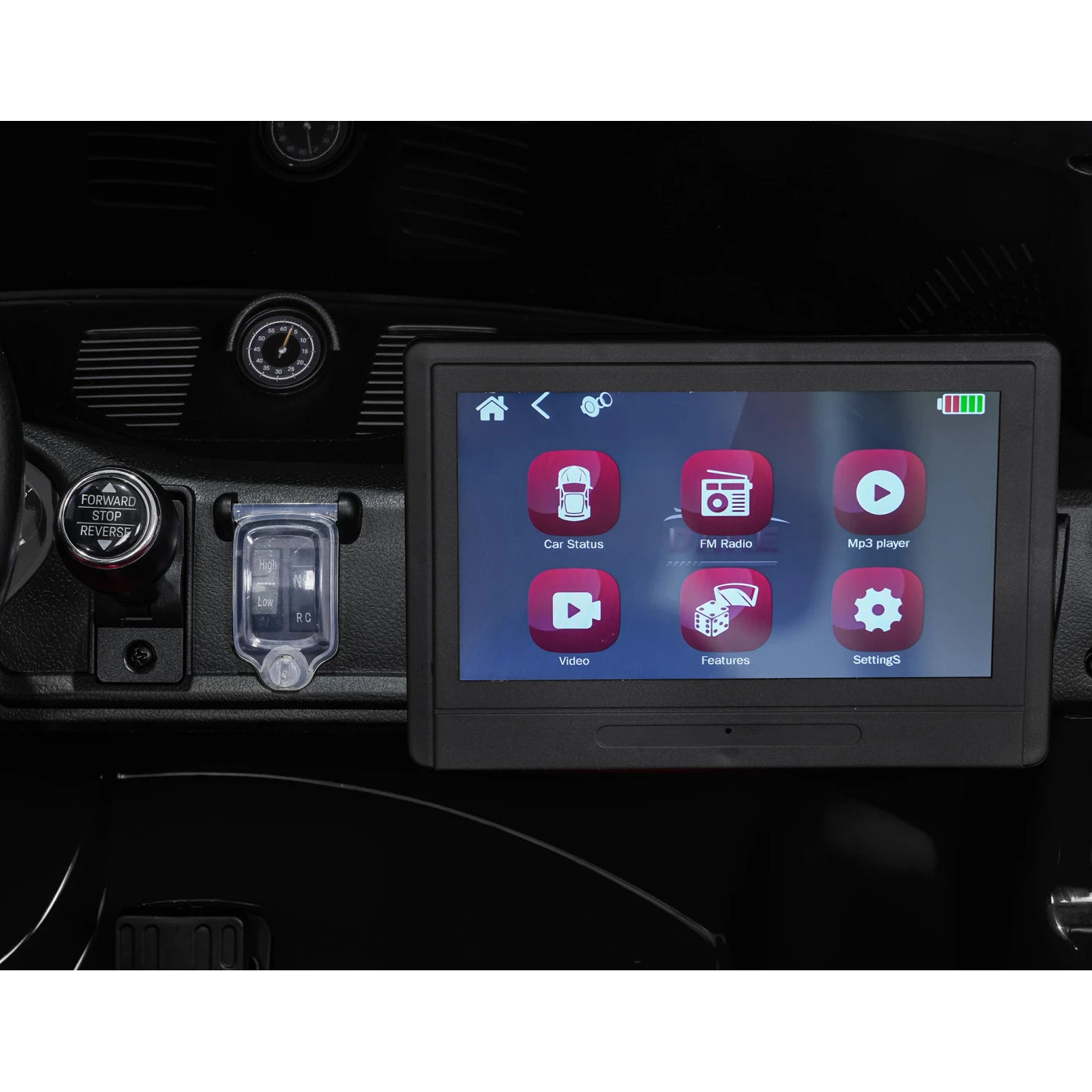 Panel de audio | Radio FM MP3 Entrada AUX Bluetooth Puerto USB Botones de sonido y claxon en el volante Melodías precargadas Tableta MP4 desmontable Nuevo panel con modo "SPORT" (sonido del vehículo al acelerar) |
