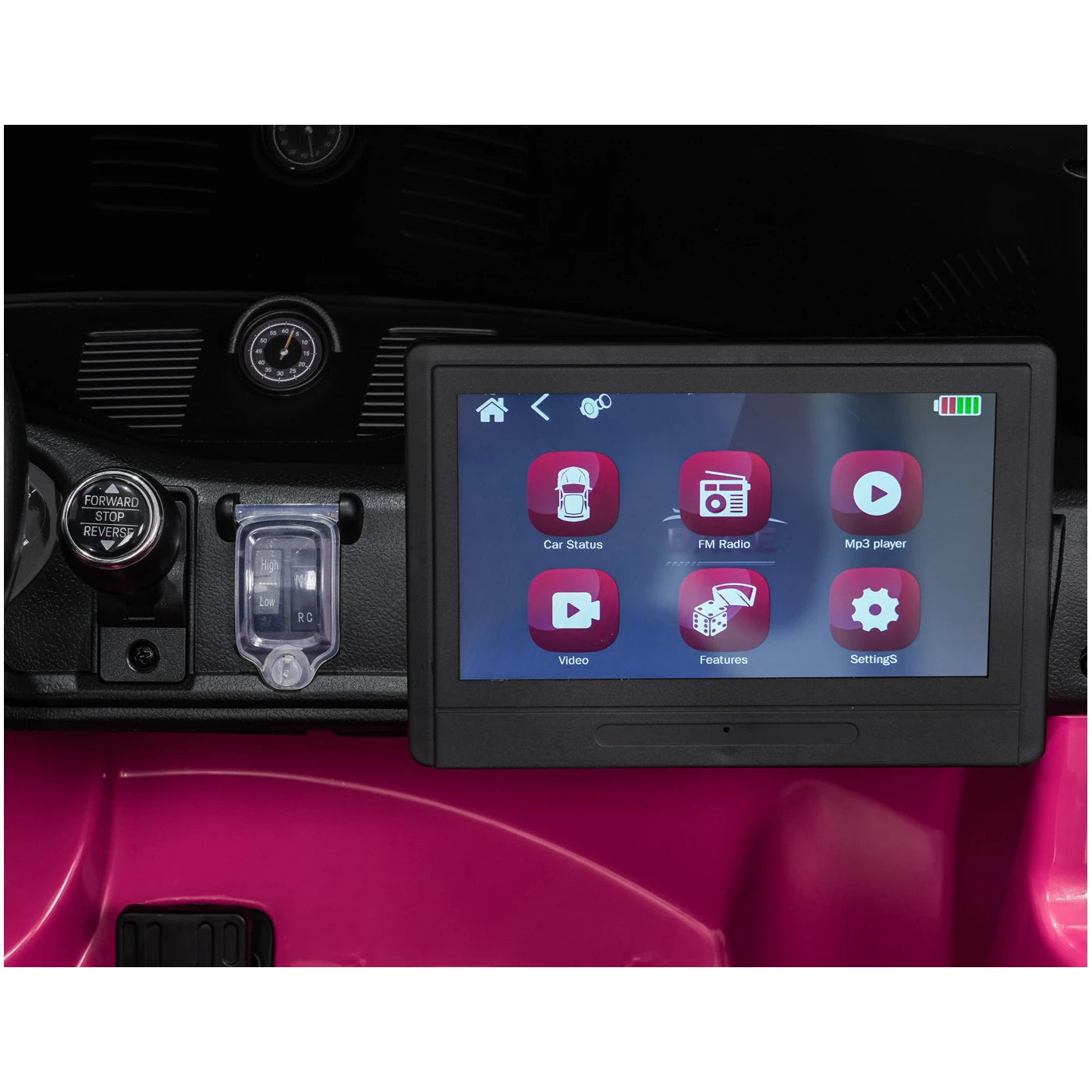 Panel de audio | Radio FM MP3 Entrada AUX Bluetooth Puerto USB Botones de sonido y claxon en el volante Melodías precargadas Tableta MP4 desmontable Nuevo panel con modo "SPORT" (sonido del vehículo al acelerar) |
