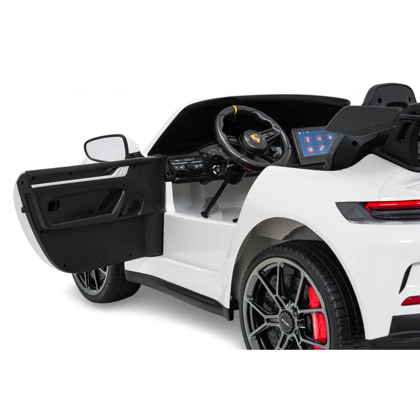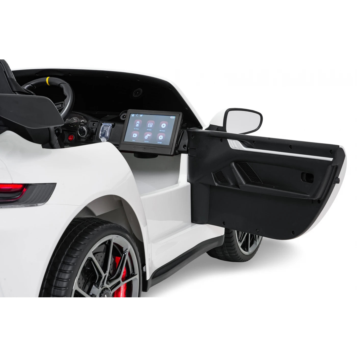 Panel de audio | Radio FM MP3 Entrada AUX Bluetooth Puerto USB Botones de sonido y claxon en el volante Melodías precargadas Tableta MP4 desmontable Nuevo panel con modo "SPORT" (sonido del vehículo al acelerar) |